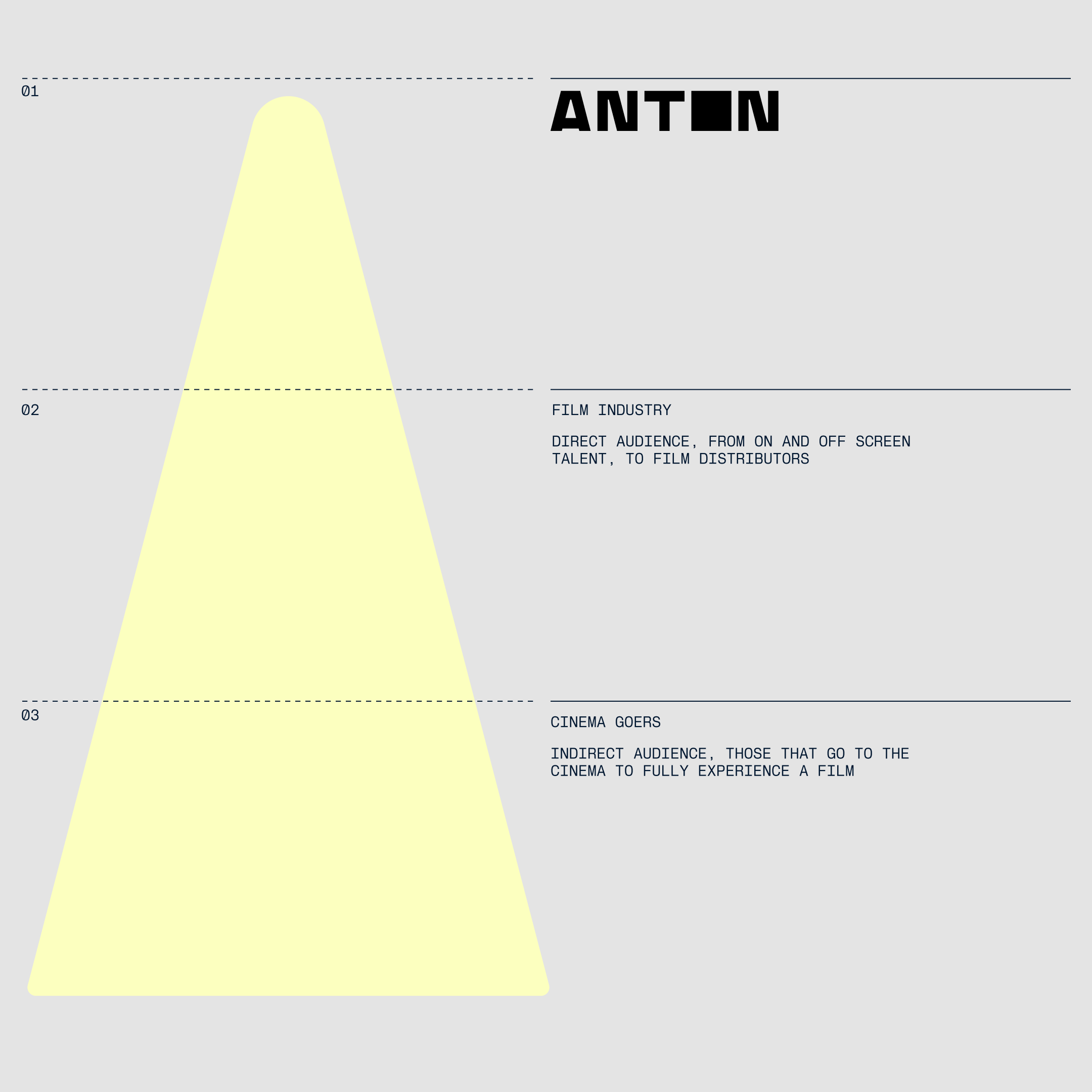 During the strategic phase, we crystallised the studio’s vision for European film-making. Focusing ANTON’S ambition on the industry it exists to enrich, we honed in on an intimate gravitas that sits at the heart of the brand’s personality. Alongside this, we evolved the studio’s name from Anton Corp, a legacy of its days as a financier, to ANTON — claiming a new level of boldness and confidence whilst retaining the reference to Anton Chekhov as a symbol of European creativity.